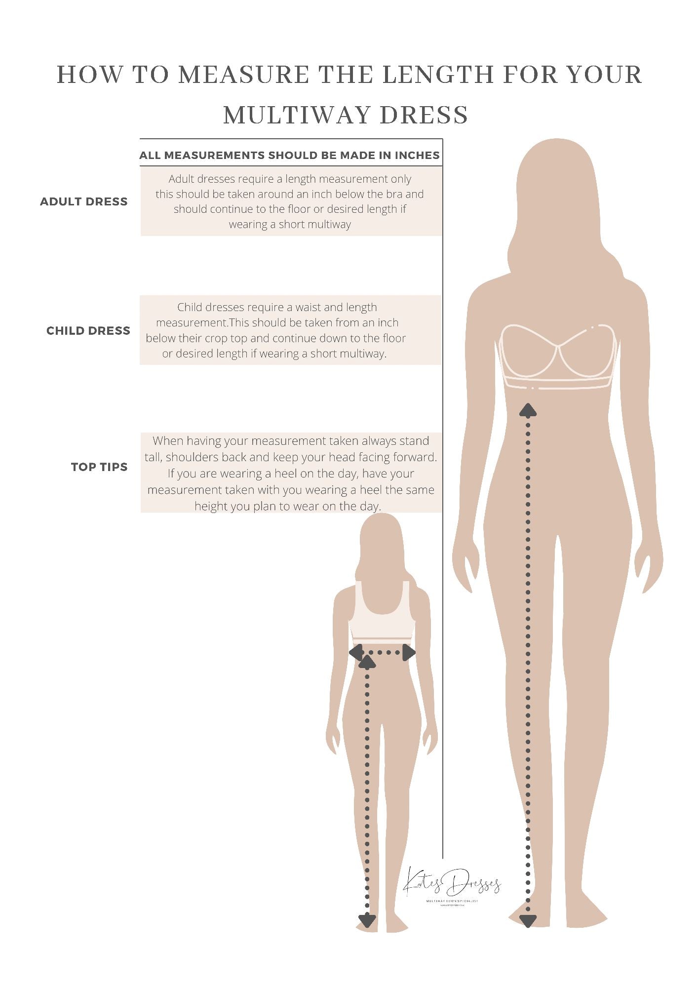Please note our gowns do not come pre-styled. They are wrap dresses that allow you to wrap the dress to your desired style. Our gowns come with an elasticated waist which will allow for weight fluctuation. Please consider heel height when choosing the length of your gown. All gowns come with a complimentary bandeau to allow for extra coverage. To work out which length is best suited for you please measure an inch or two from under the bust to the floor or desired length in inches, And measure under the bust in inches for the perfect waist measurements.