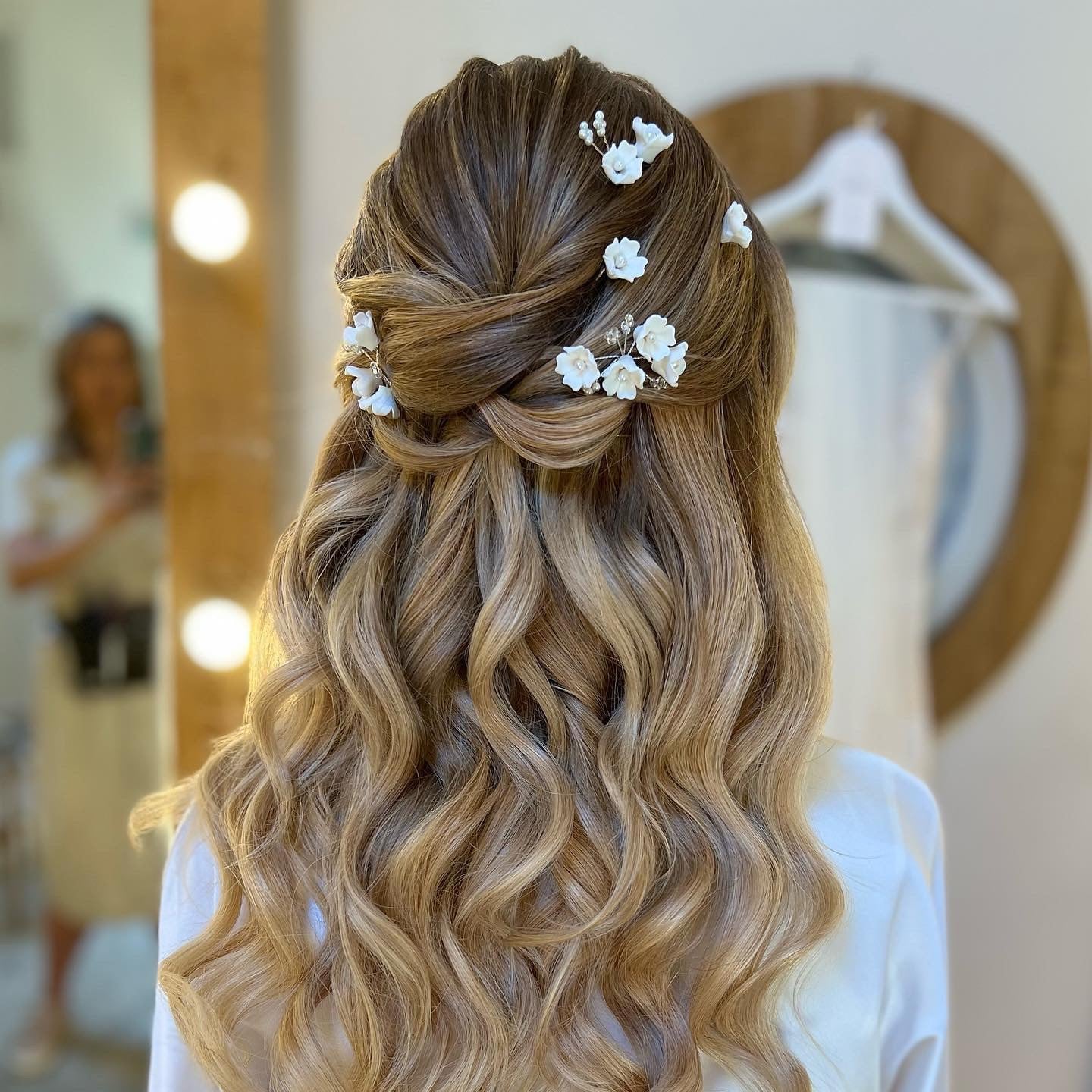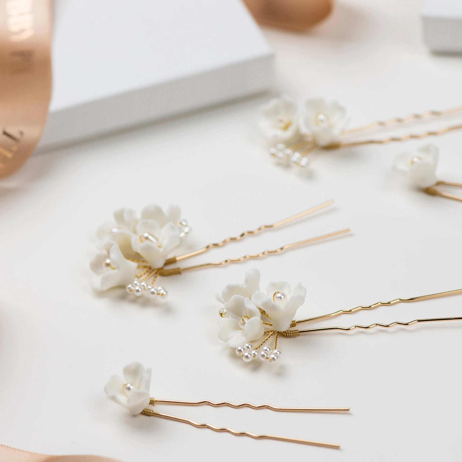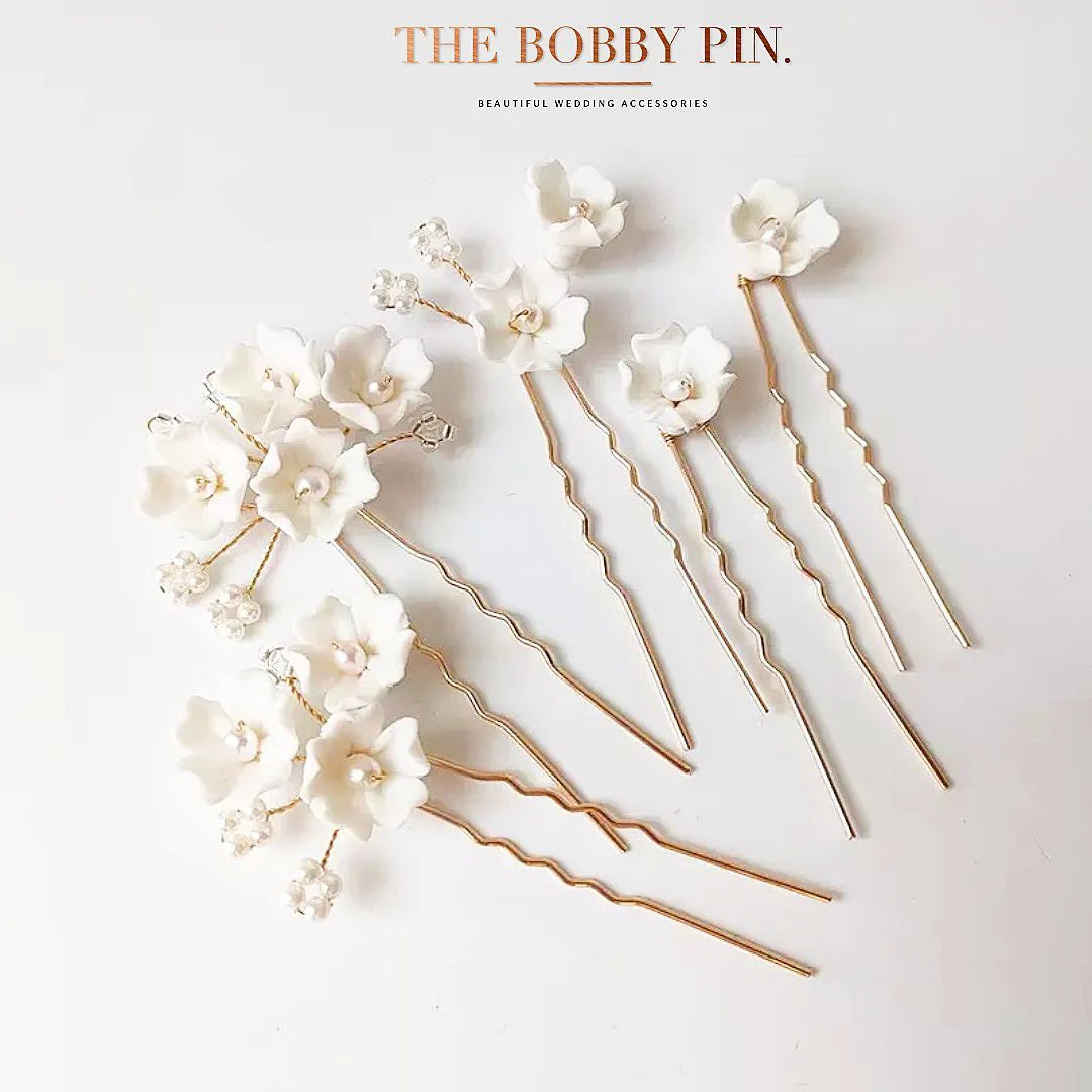 These pins are made of beautiful porcelain flowers with pearl sprays.
