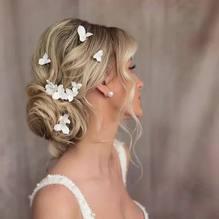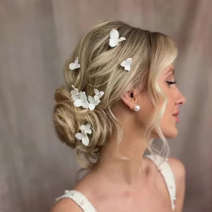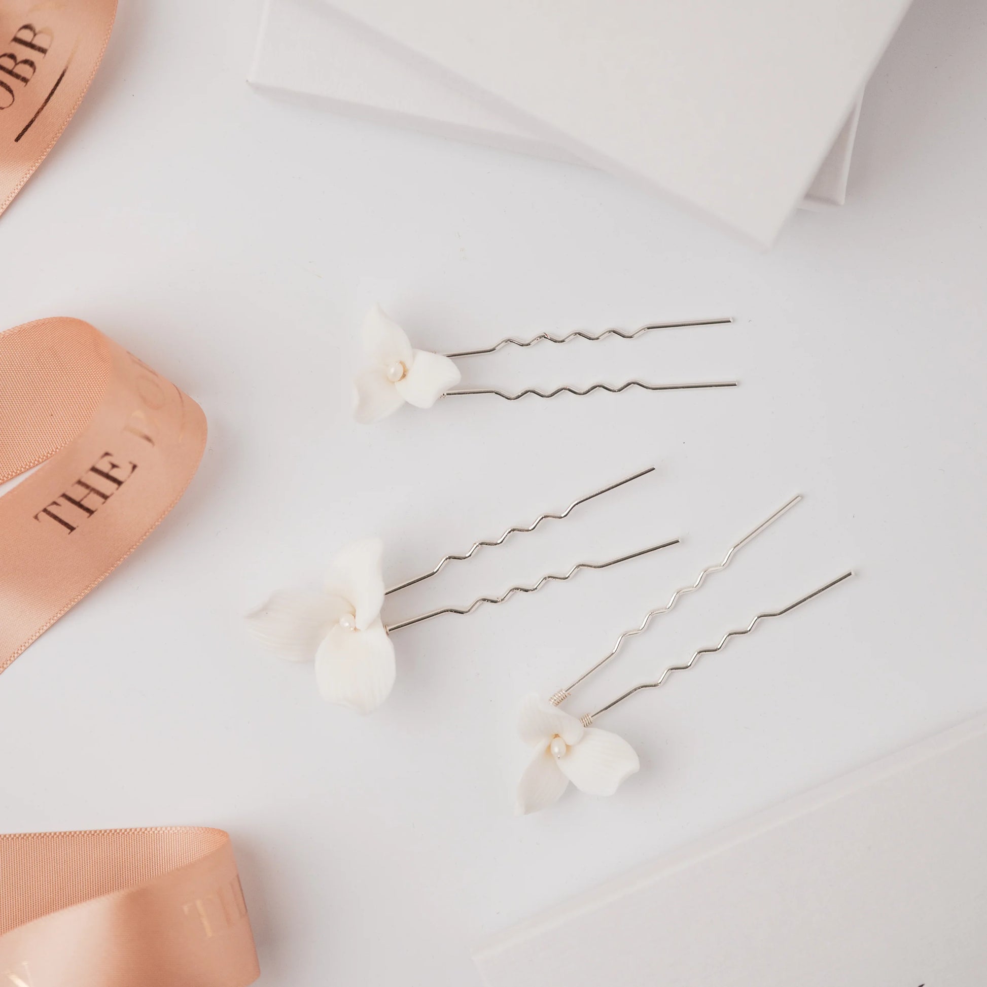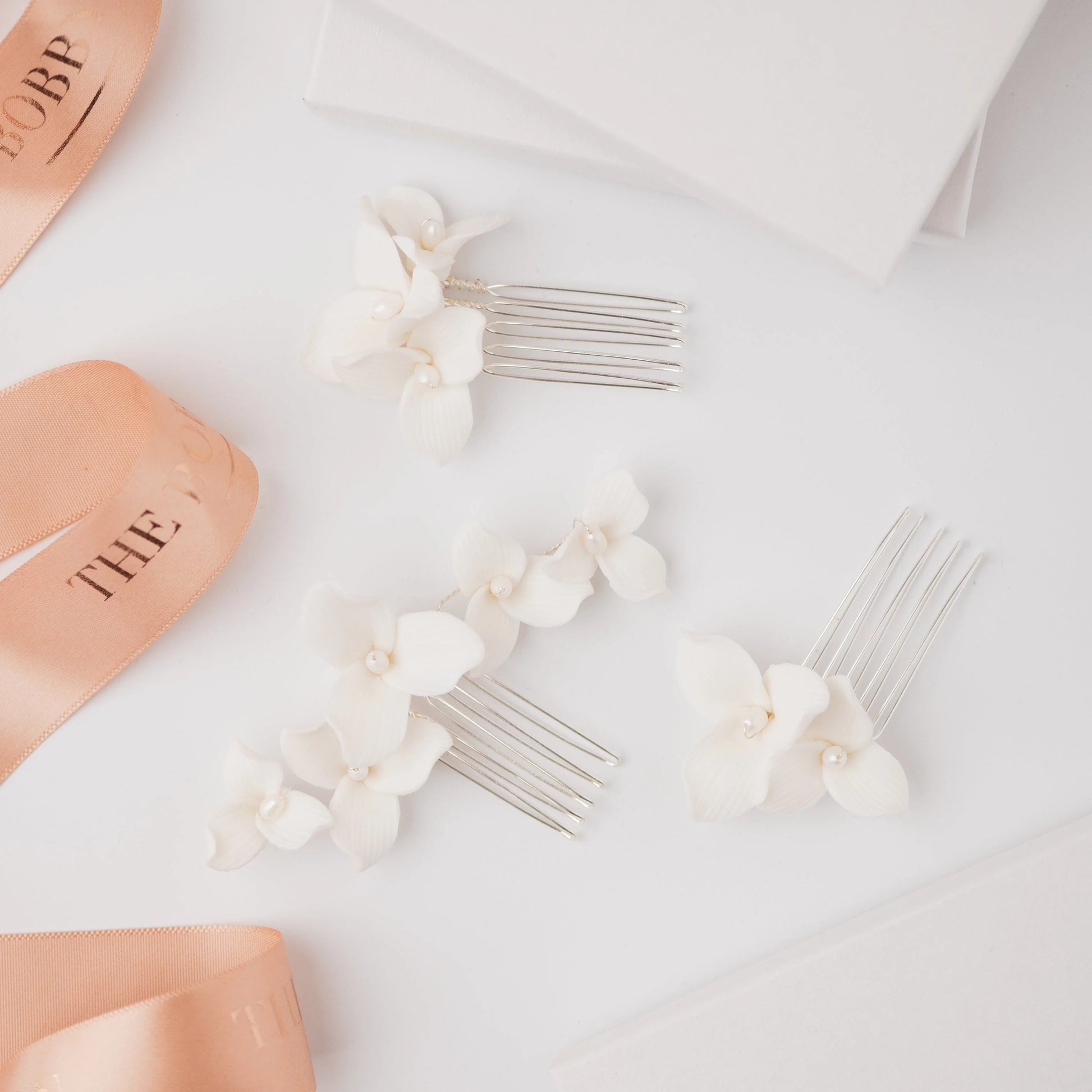 The combs/pins are made of beautiful clay flowers with a pearl stamen