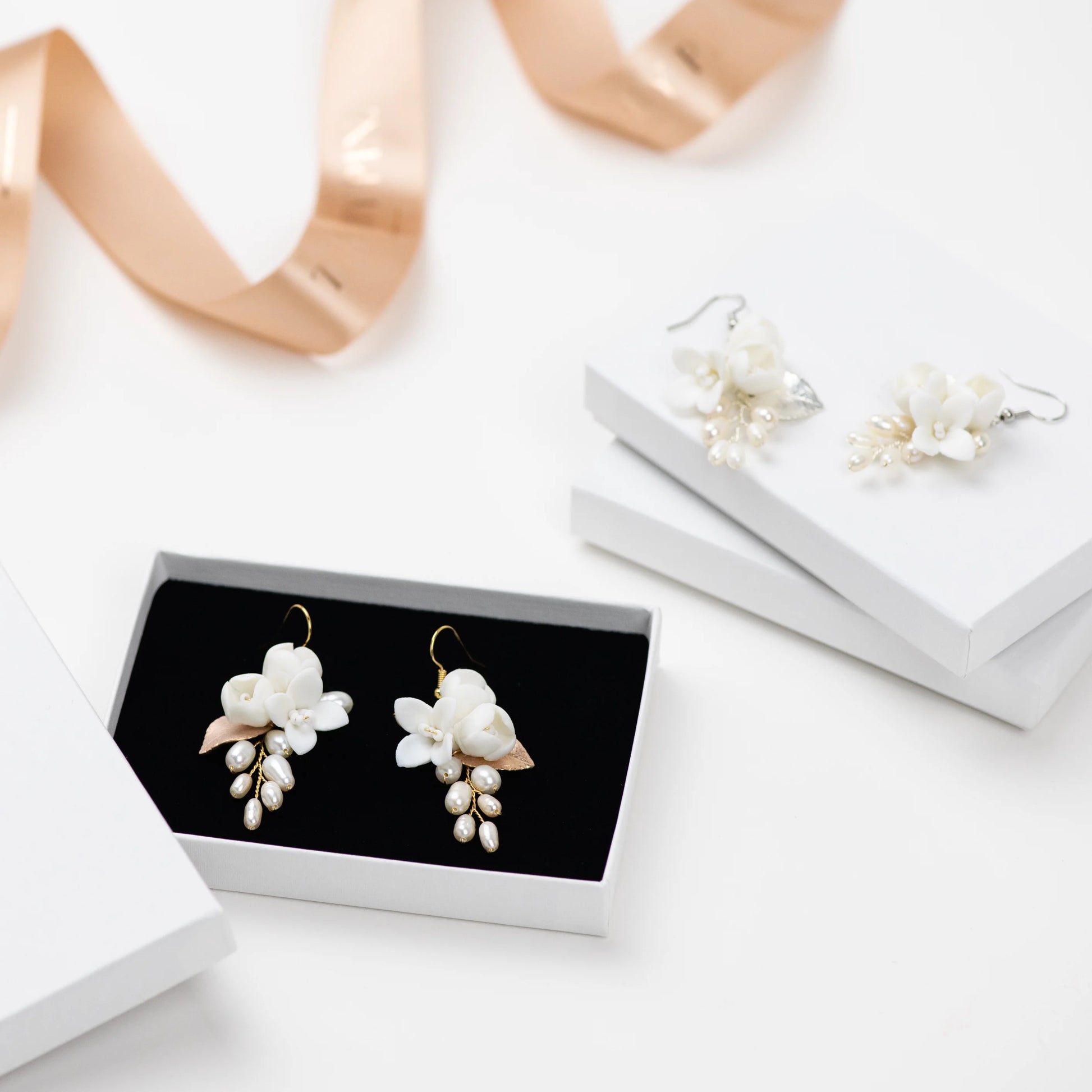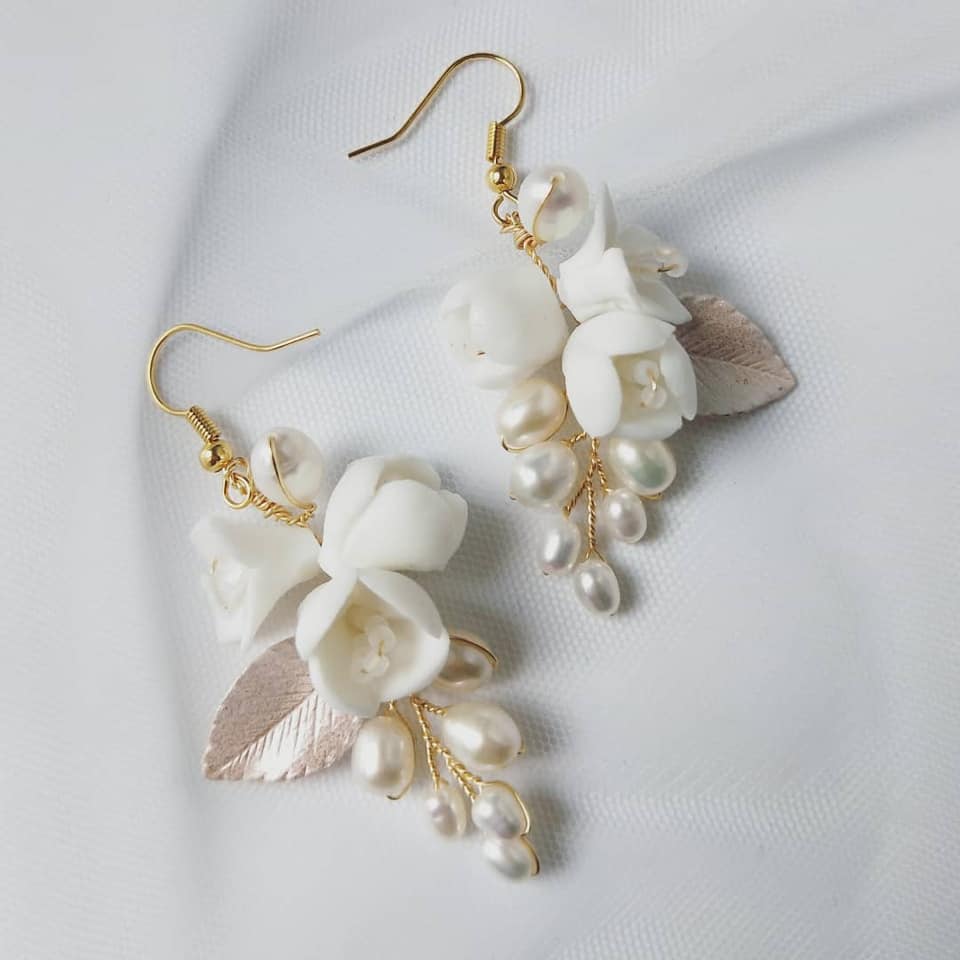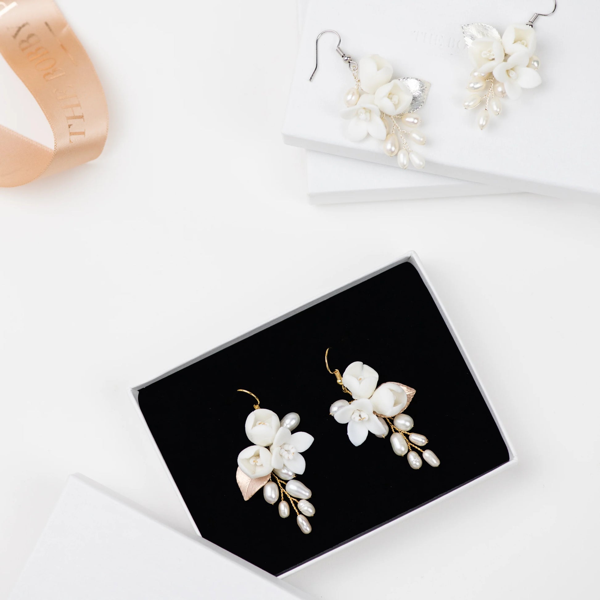 White porcelain fluted earrings with pearl sprays and blush leaves on a loop earring.