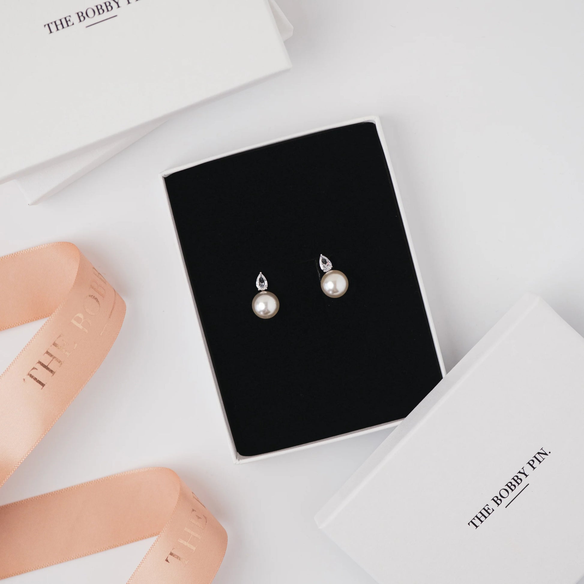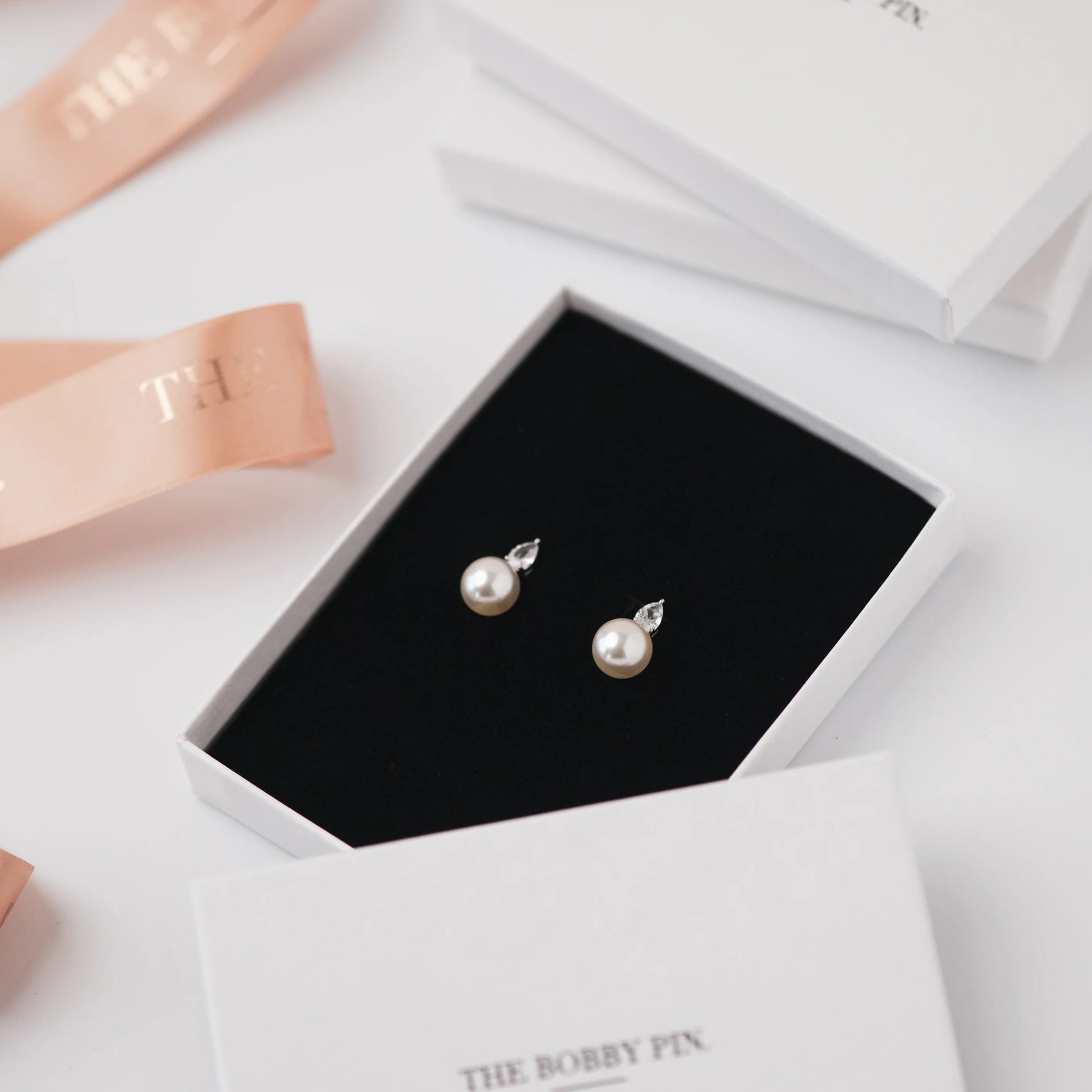 The "Scout" Earrings made in silver with a crystal stud with a pearl drop design.